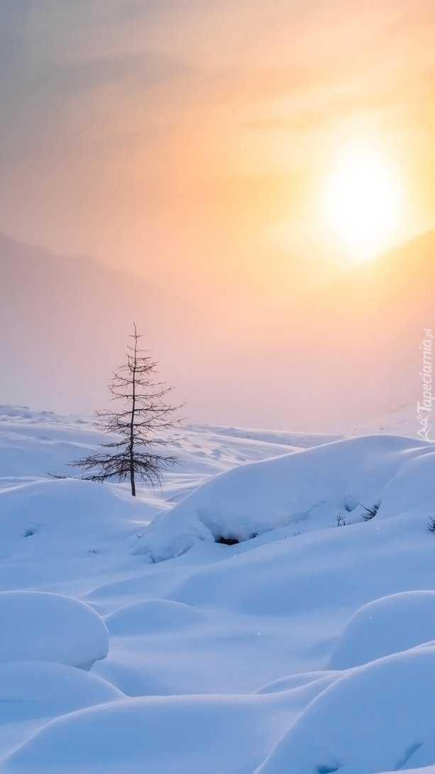 Edytor tapety: Drzewo w śniegu i przymglone słońce