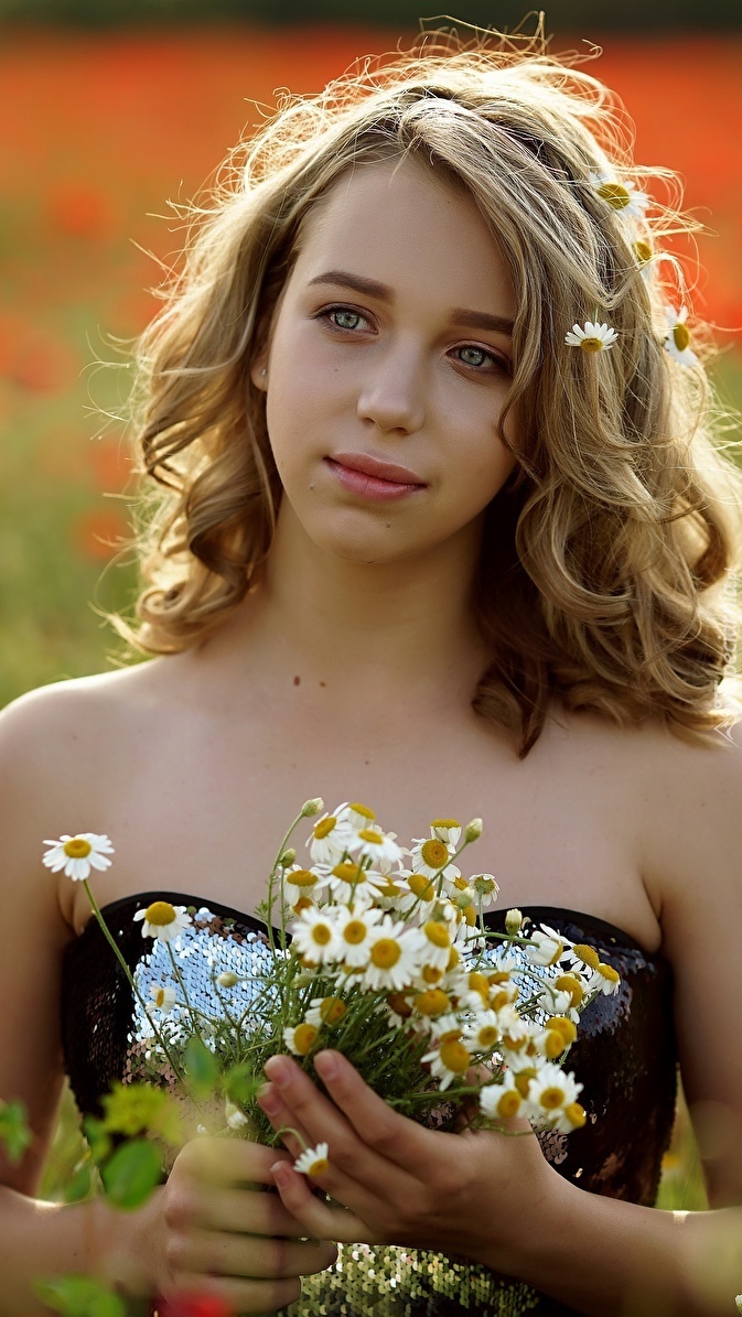 Edytor tapety: Blondynka z bukiecikiem rumianków