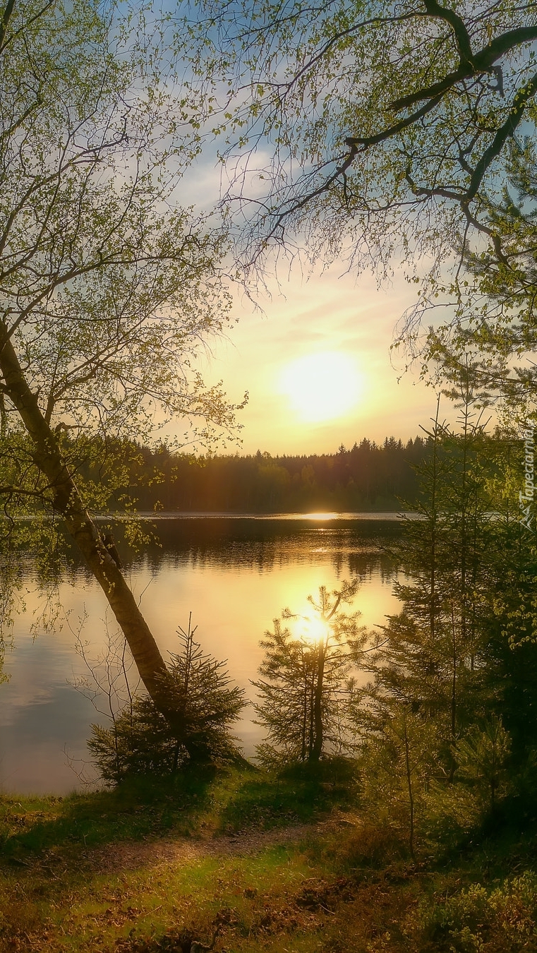 Edytor tapety: Brzozy nad jeziorem w blasku słońca