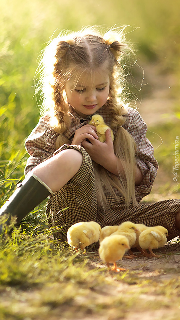 Edytor tapety: Dziewczynka z kurczaczkami na trawie