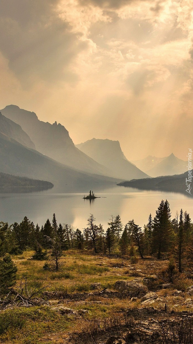 Edytor tapety: Mała wysepka na górskim jeziorze