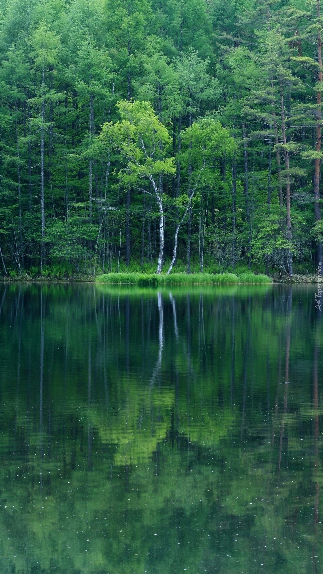 Edytor tapety: Zielony las nad jeziorem