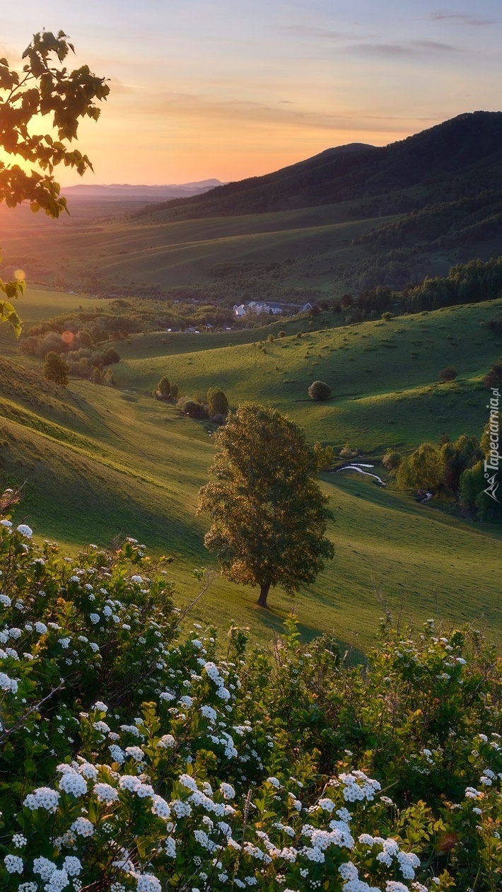 Edytor tapety: Górska dolina w zachodzącym słońcu