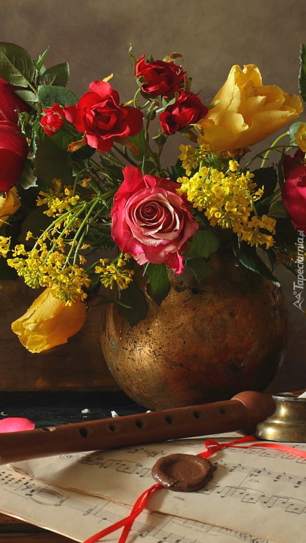 Edytor tapety: Flet obok kwiatów w wazonie
