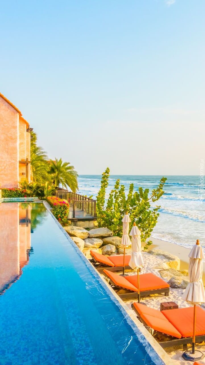 Edytor tapety: Leżaki na plaży obok basenu
