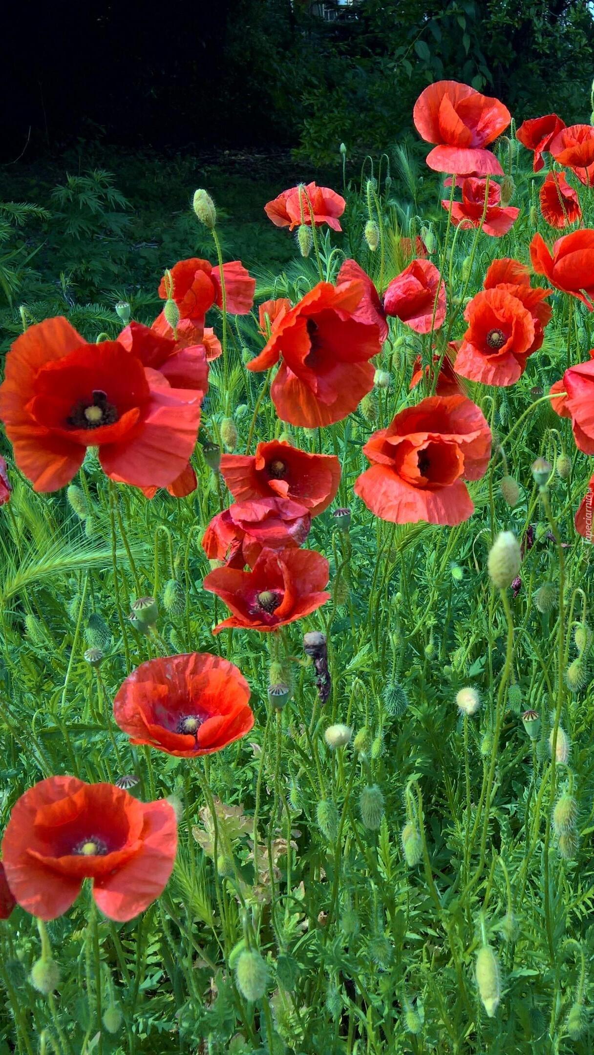 Edytor tapety: Maki w zielonym zbożu