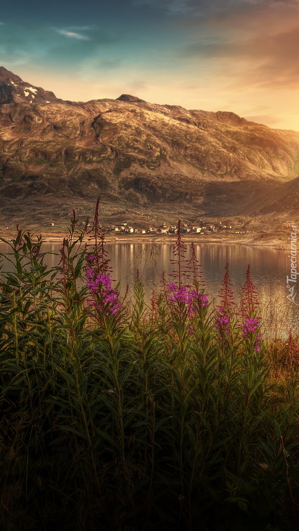 Edytor tapety: Kwiaty na tle gór i jeziora