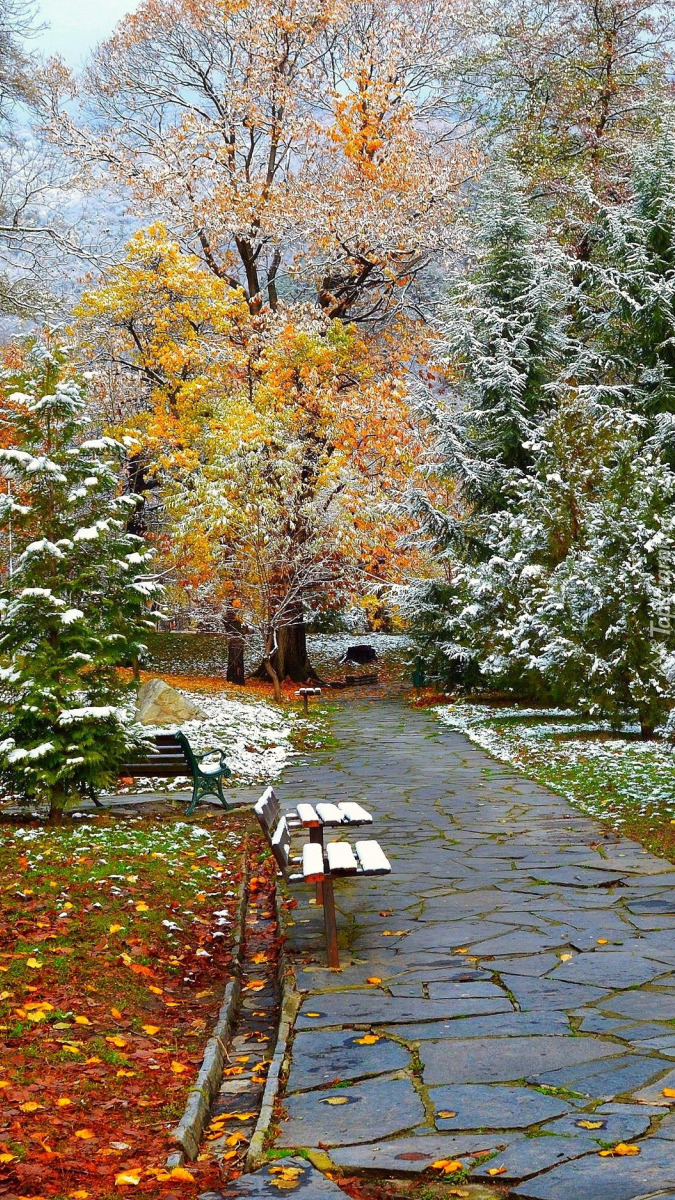 Edytor tapety: Śnieg na jesiennych drzewach w parku