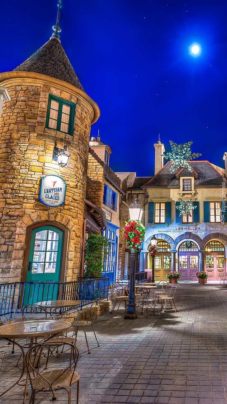Edytor tapety: Oświetlone domy na uliczce w Disneylandzie