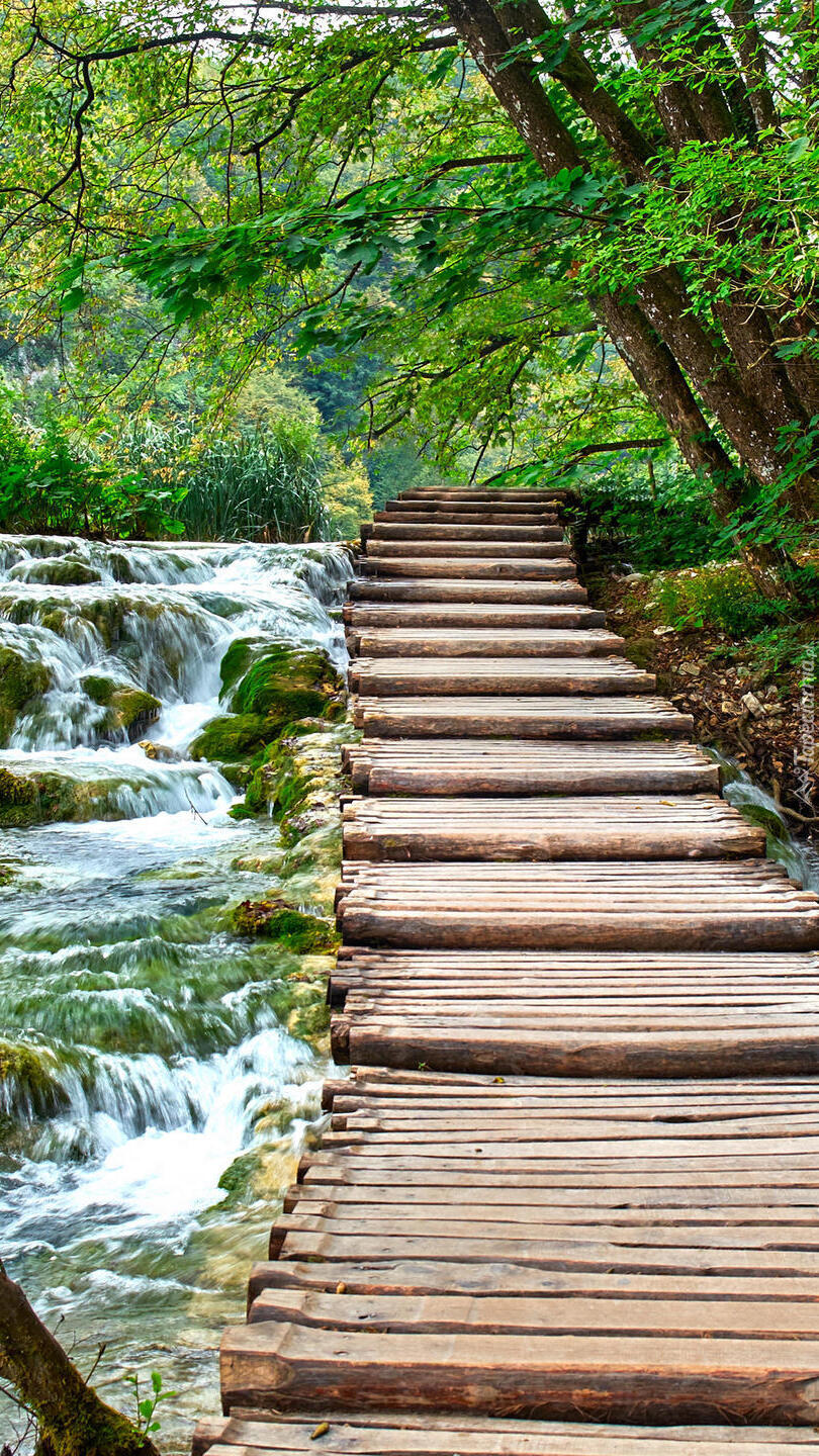 Edytor tapety: Drzewa przy pomoście nad rzeką