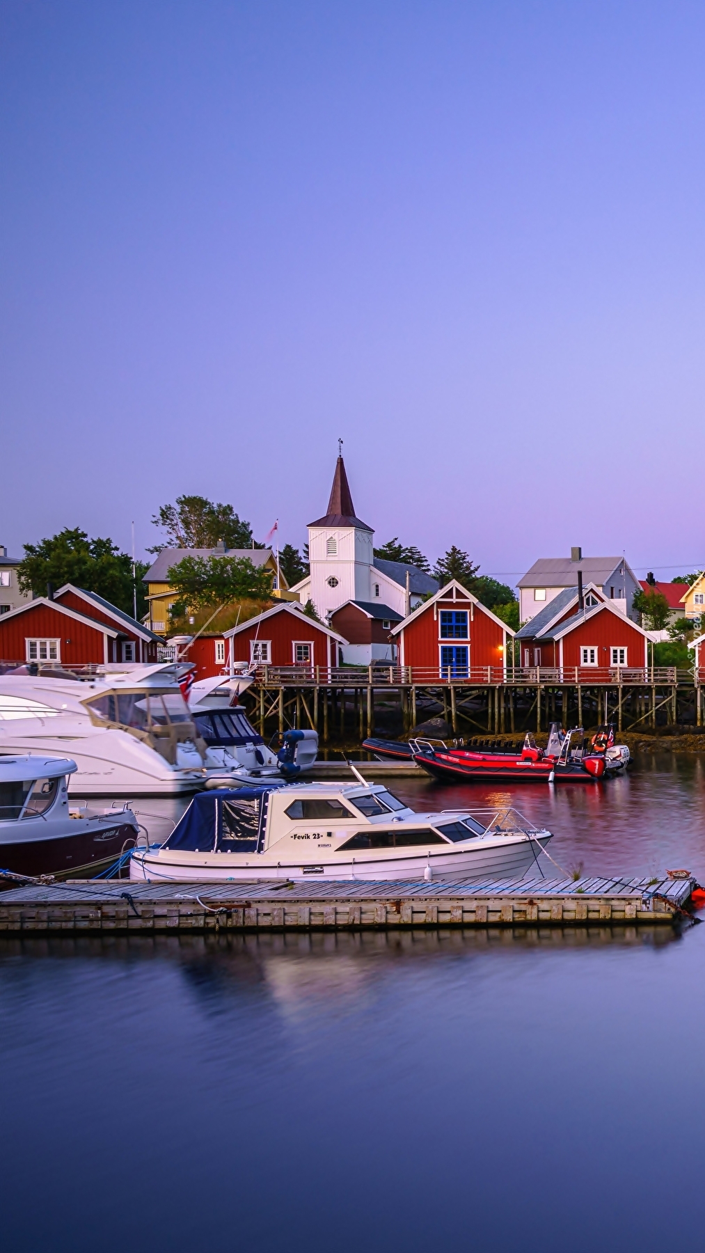 Edytor tapety: Łódki obok czerwonych domów na przystani