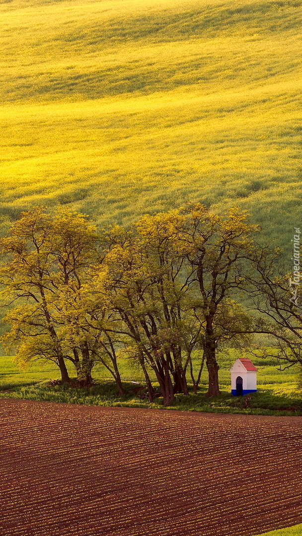 Edytor tapety: Kapliczka pod drzewami na polach uprawnych