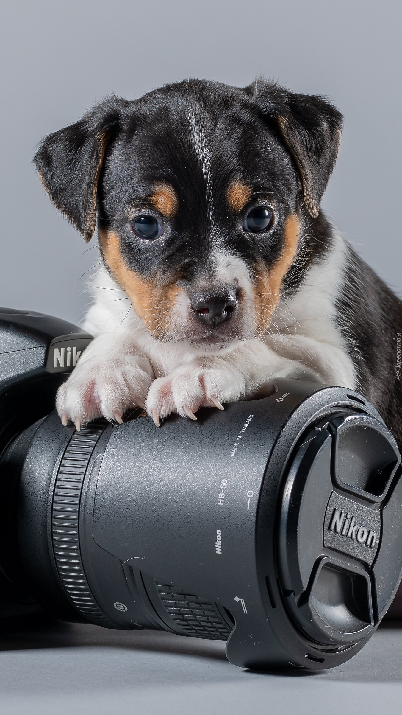 Edytor tapety: Szczeniak z łapkami na aparacie fotograficznym