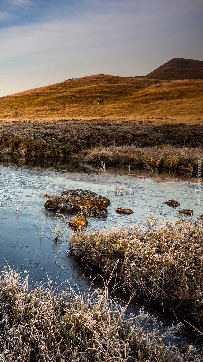Edytor tapety: Oszroniona trawa nad jeziorem