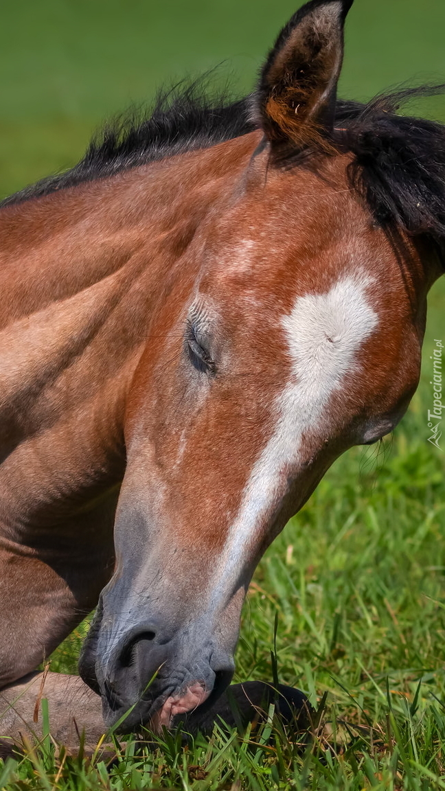 Edytor tapety: Głowa źrebaka lezącego na trawie