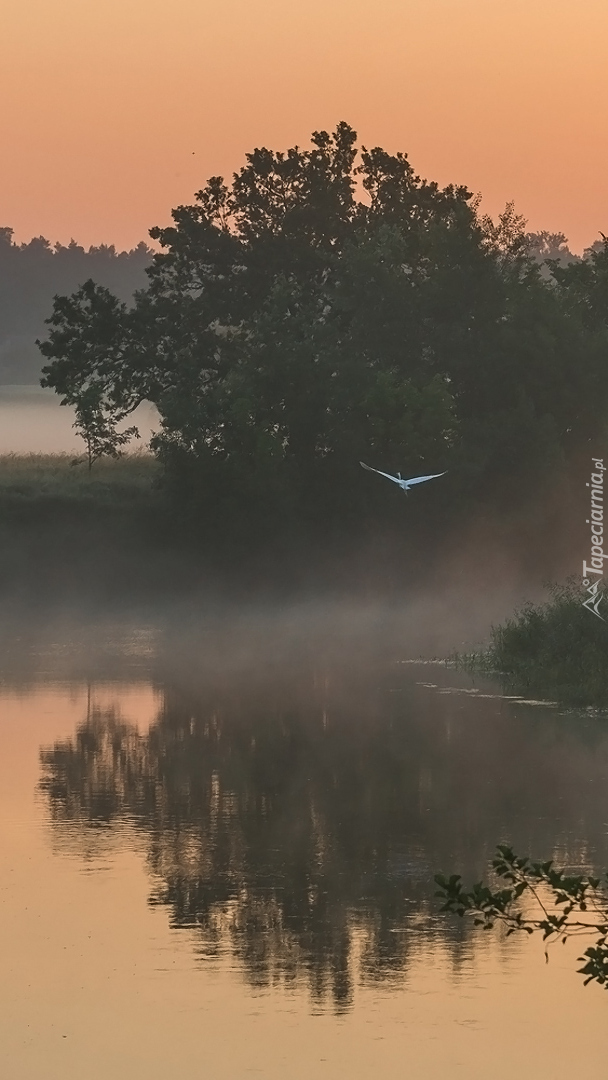 Edytor tapety: Drzewa i ptak nad zamgloną rzeką