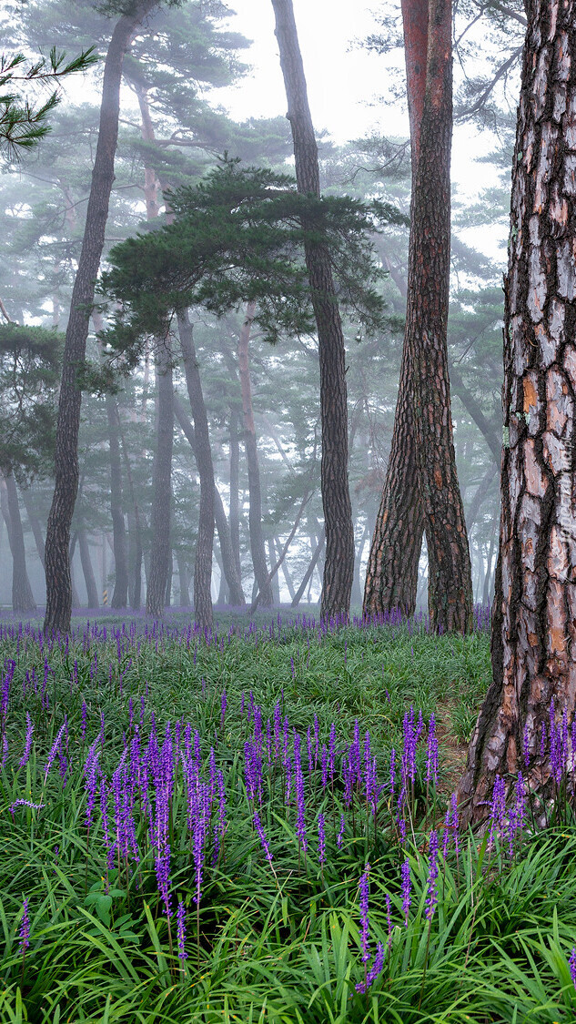 Edytor tapety: Fioletowe kwiaty pod sosnami