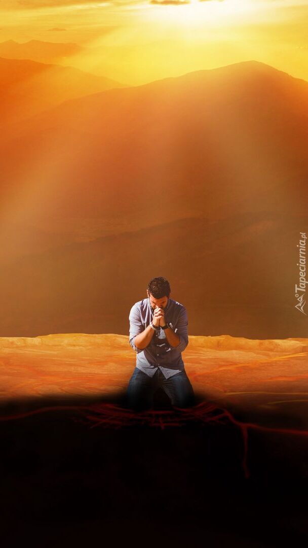 Edytor tapety: Klęczący mężczyzna na tle zachodu słońca