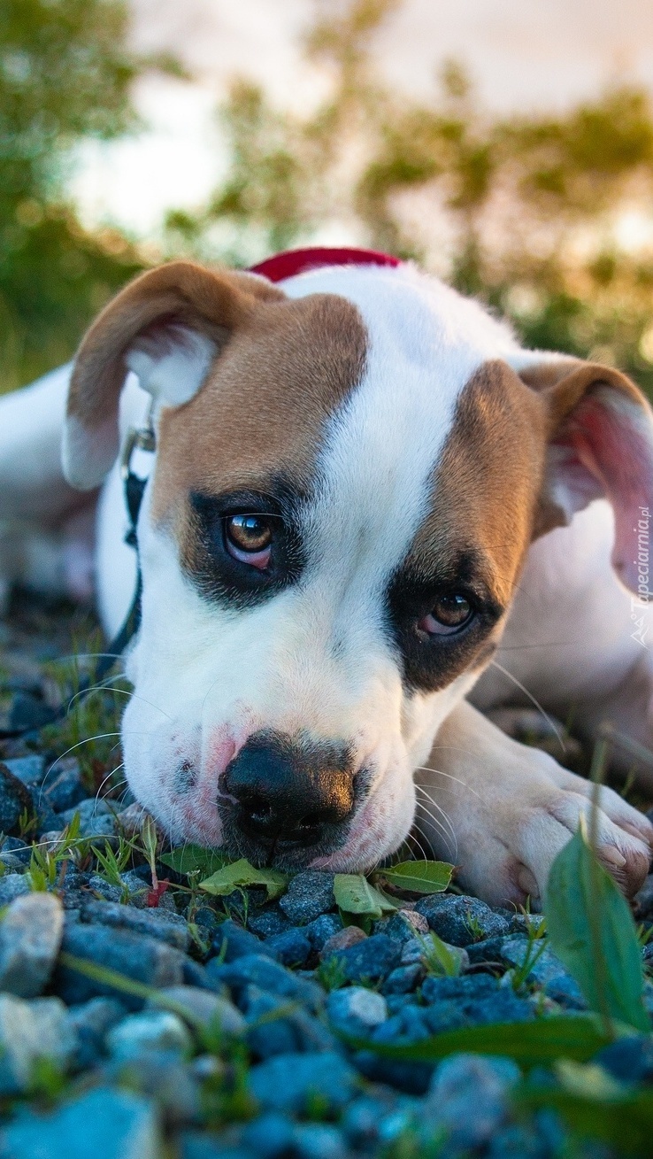 Edytor tapety: Amstaffik zmęczony leży na kamieniach
