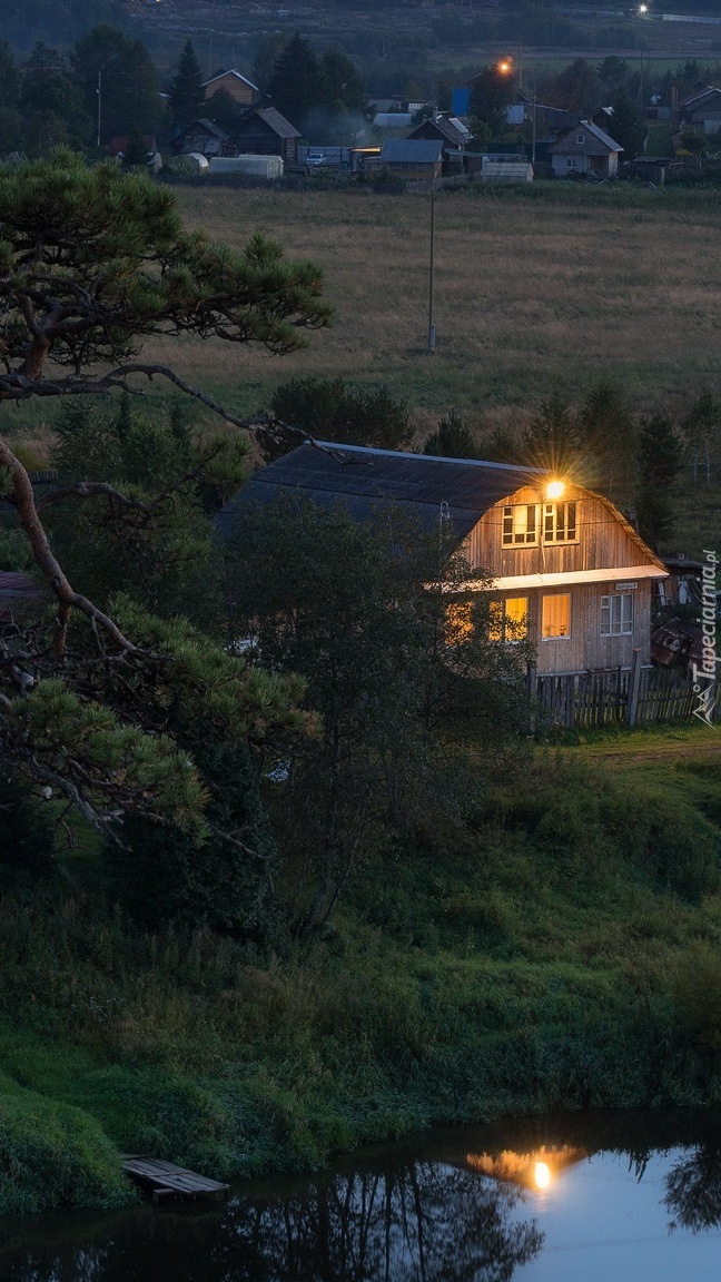 Edytor tapety: Oświetlony dom nad stawem