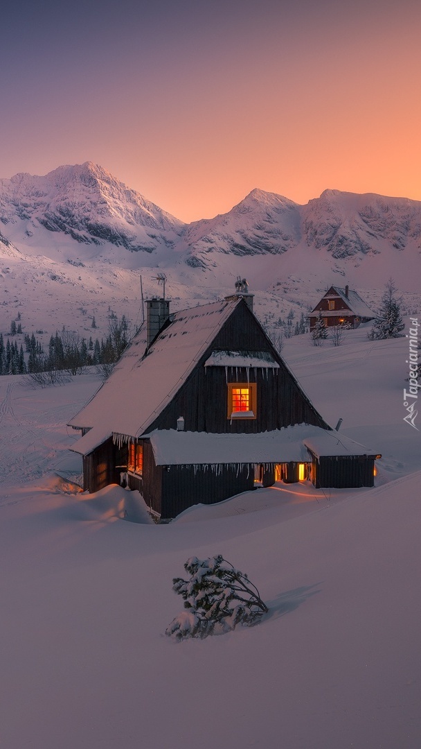 Edytor tapety: Oświetlony domek w górach zimą