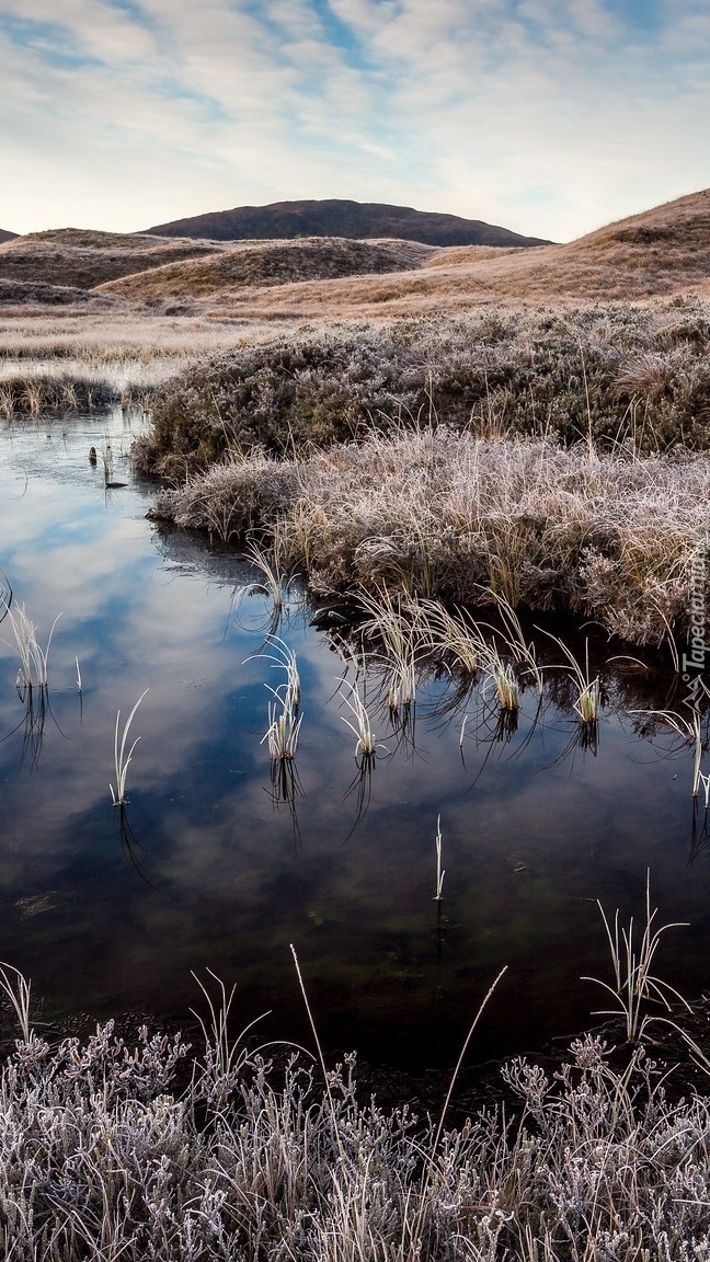 Edytor tapety: Oszroniona trawa nad jeziorem