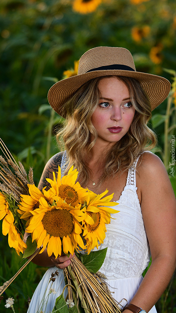 Edytor tapety: Blondynka z bukietem słoneczników