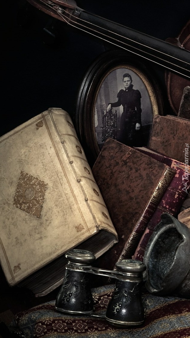 Edytor tapety: Stare książki obok fotografii kobiety