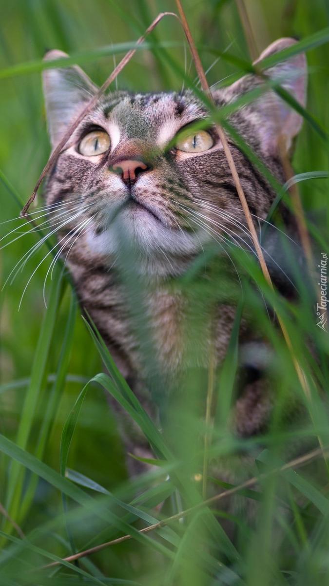 Edytor tapety: Kot w trawie patrzący w górę
