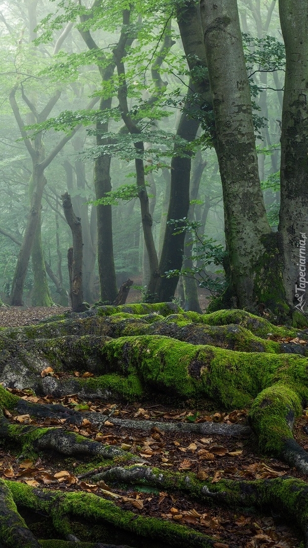 Edytor tapety: Omszałe pnie w zamglonym lesie