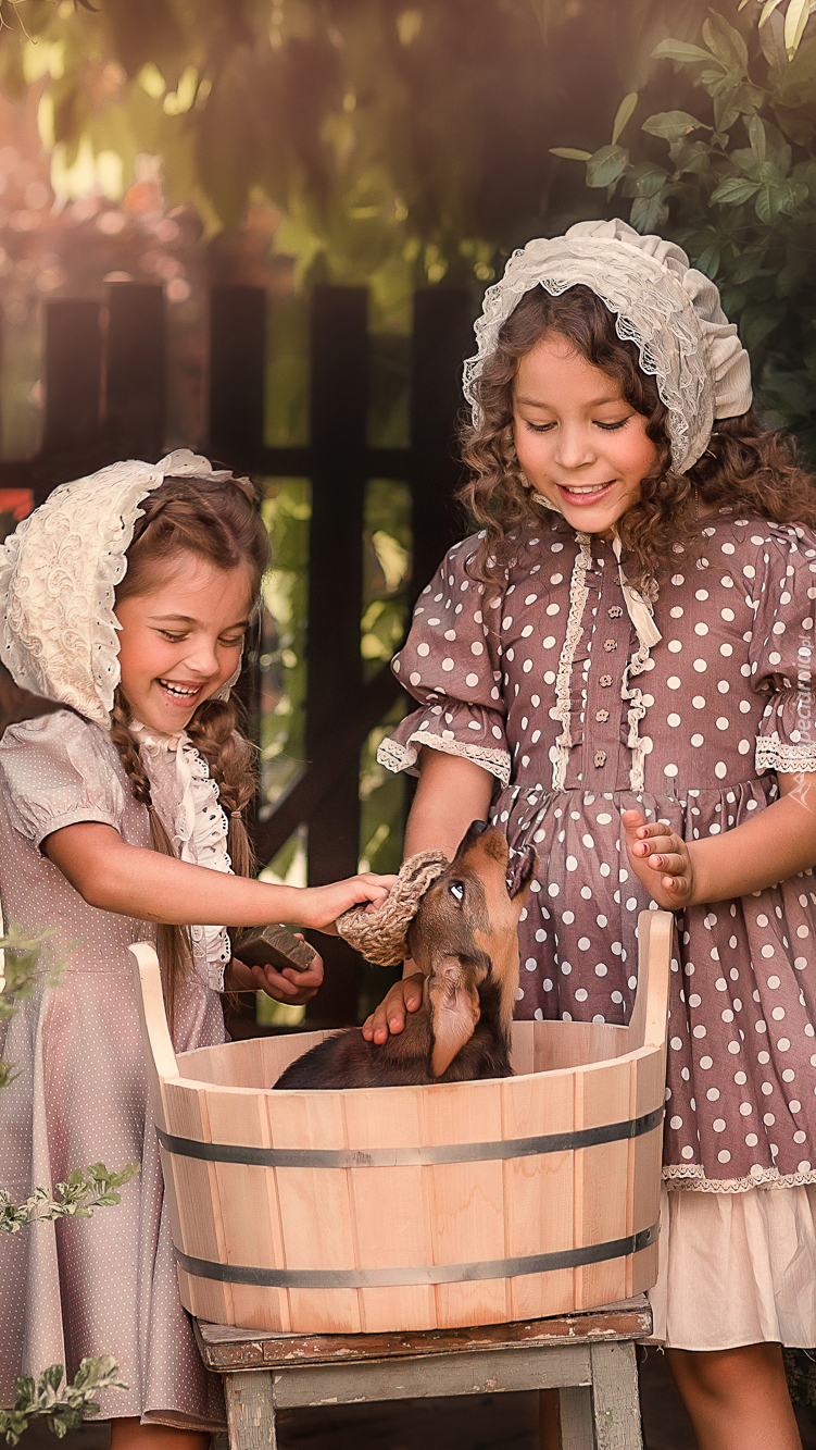 Edytor tapety: Dziewczynki kapiące psa