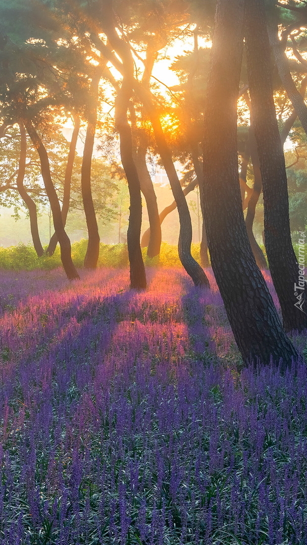 Edytor tapety: Fioletowe kwiaty pod drzewami