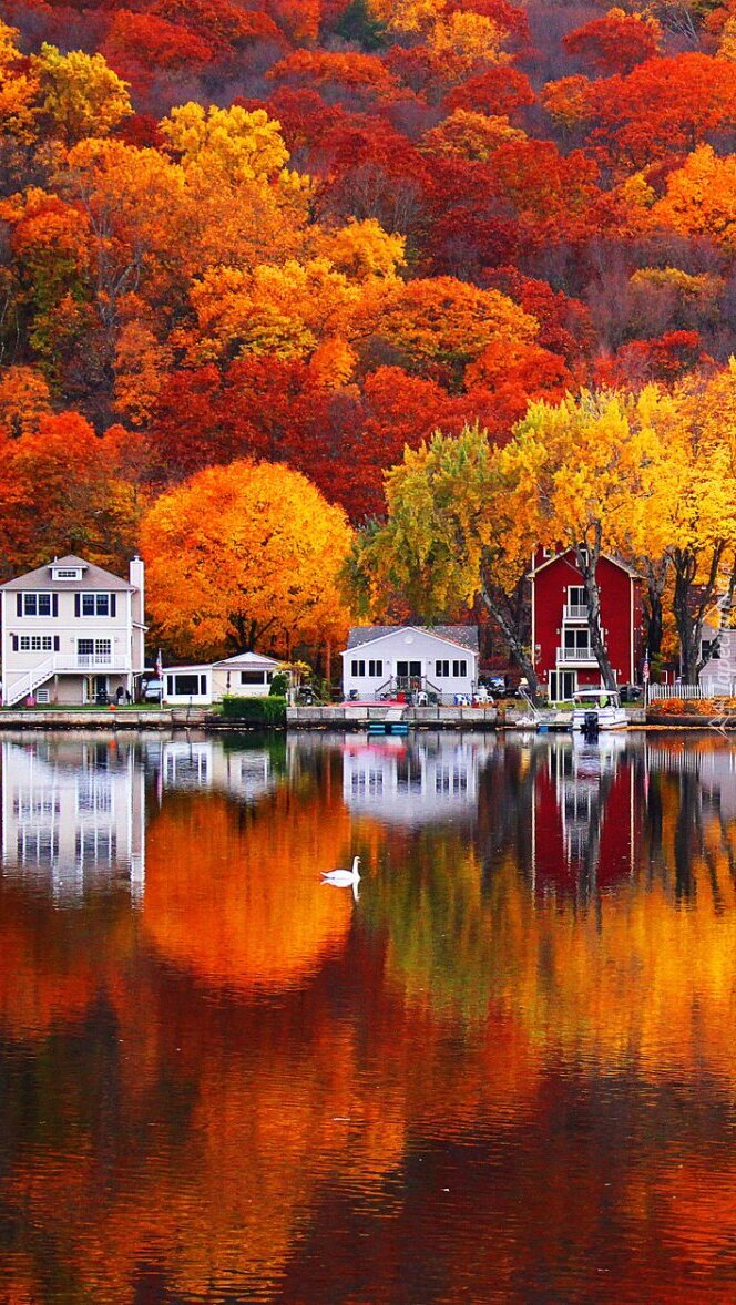 Edytor tapety: Domy pod jesiennymi drzewami nad jeziorem