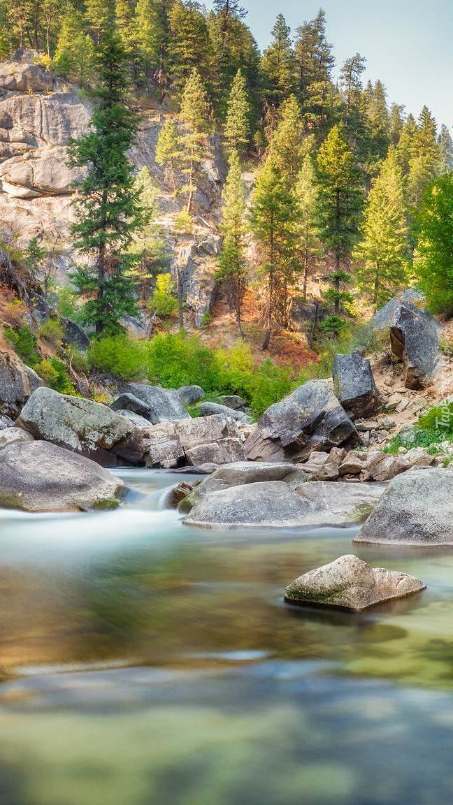Edytor tapety: Drzewa i skały nad rzeką