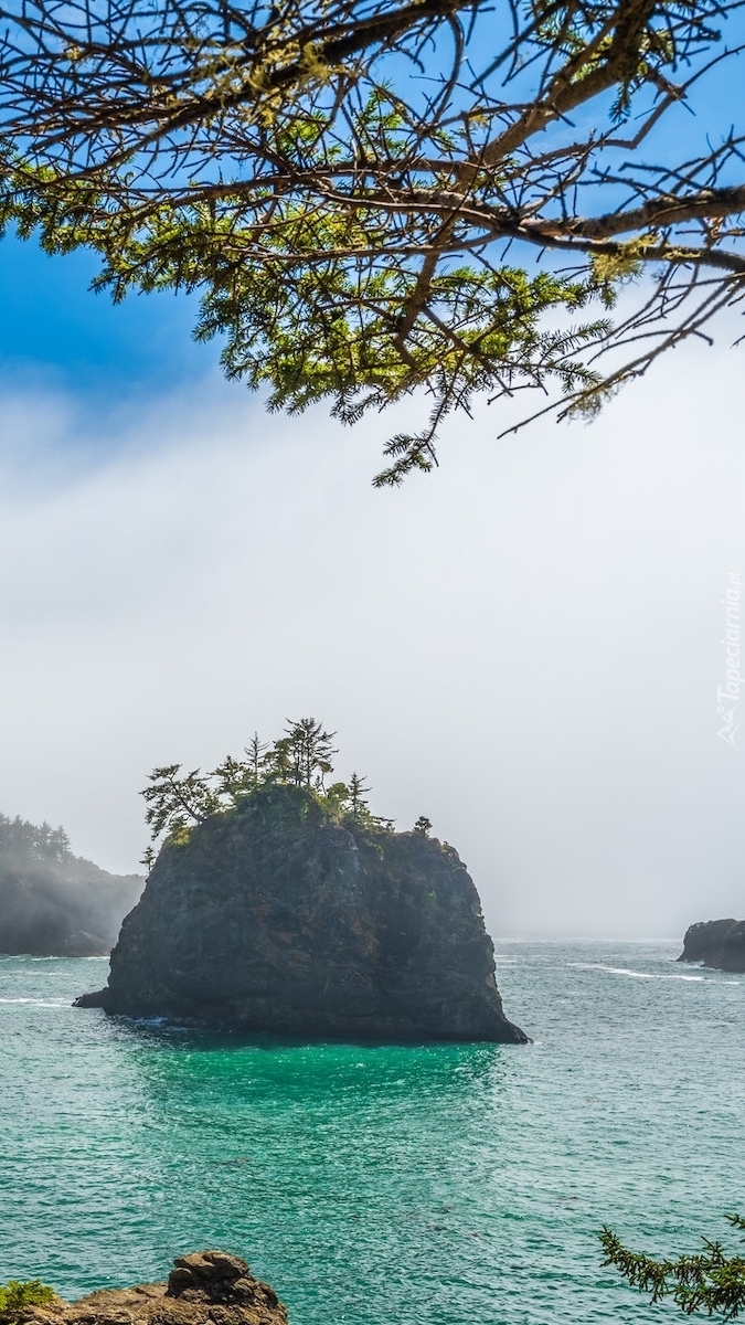 Edytor tapety: Porośnięte drzewami skały w morzu