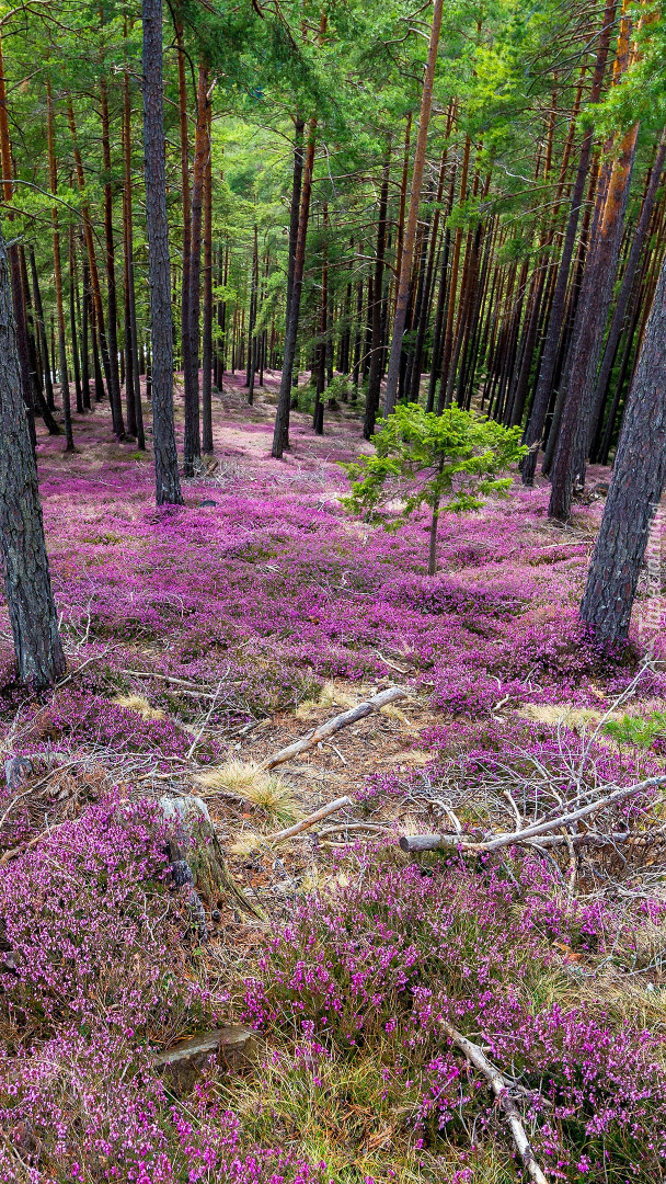 Edytor tapety: Wrzosy pod drzewami w lesie