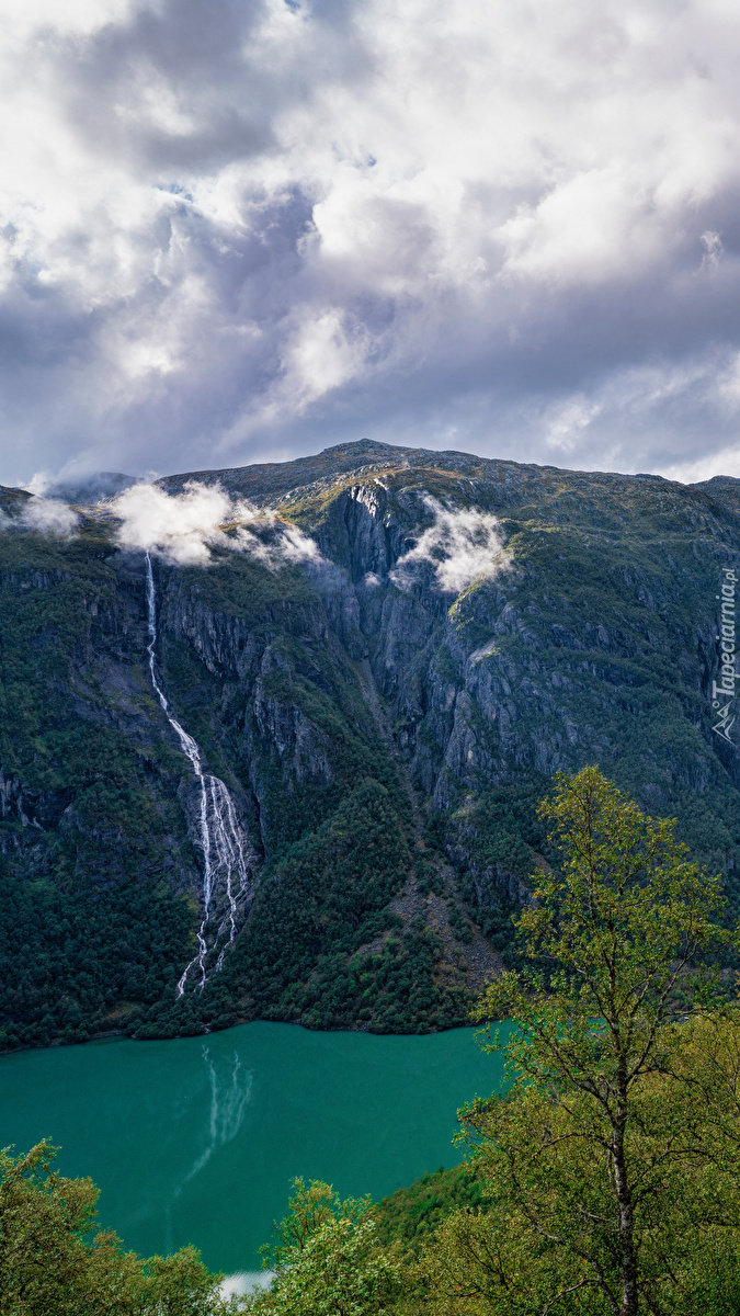 Edytor tapety: Wodospad wpadający z góry do jeziora