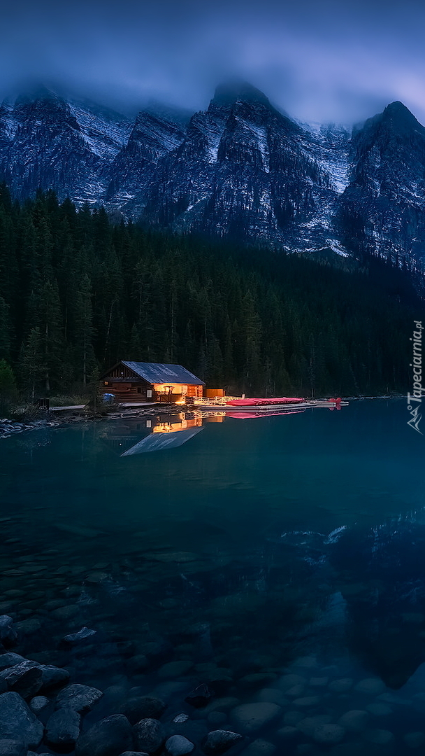 Edytor tapety: Oświetlony dom nad jeziorem Lake Louise
