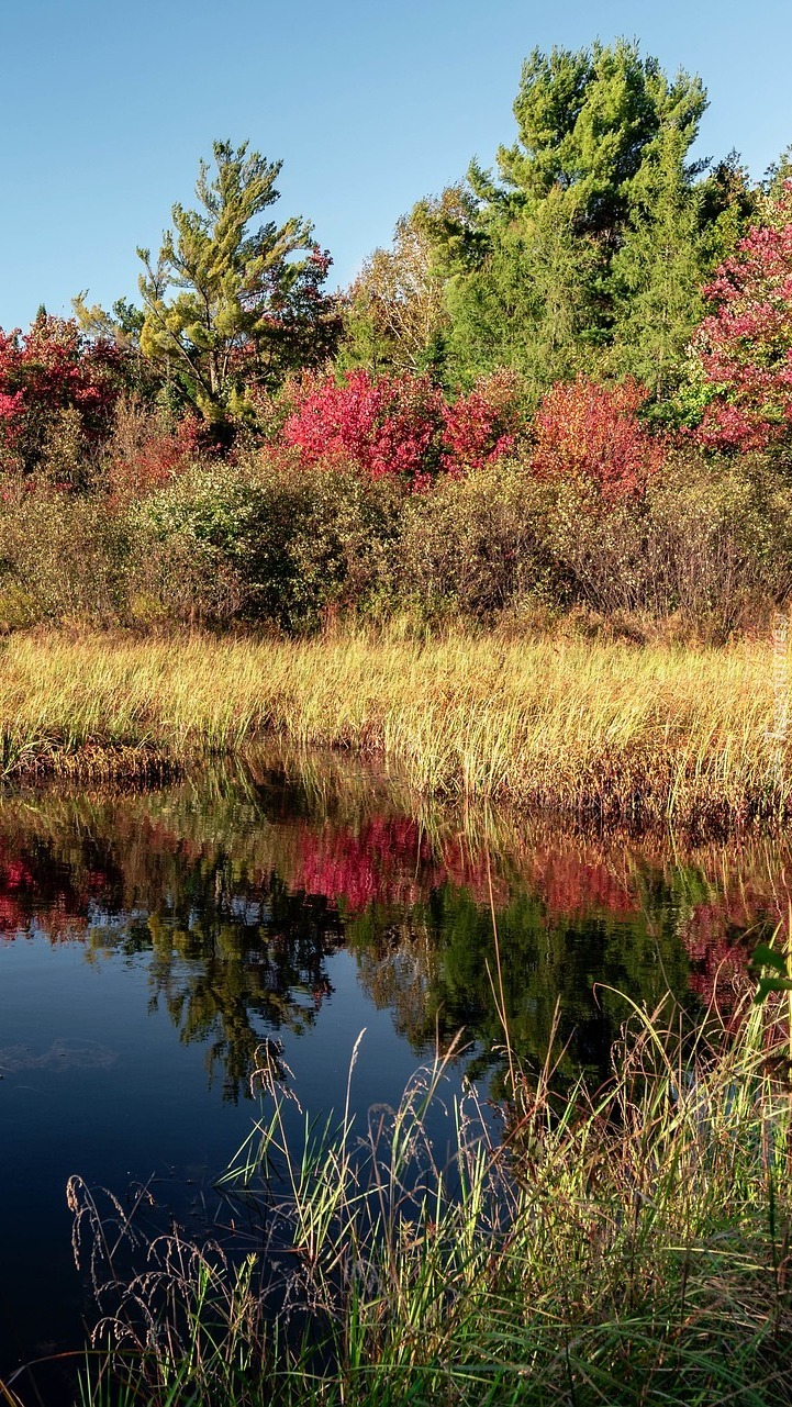 Edytor tapety: Jesienne drzewa i trawa nad stawem