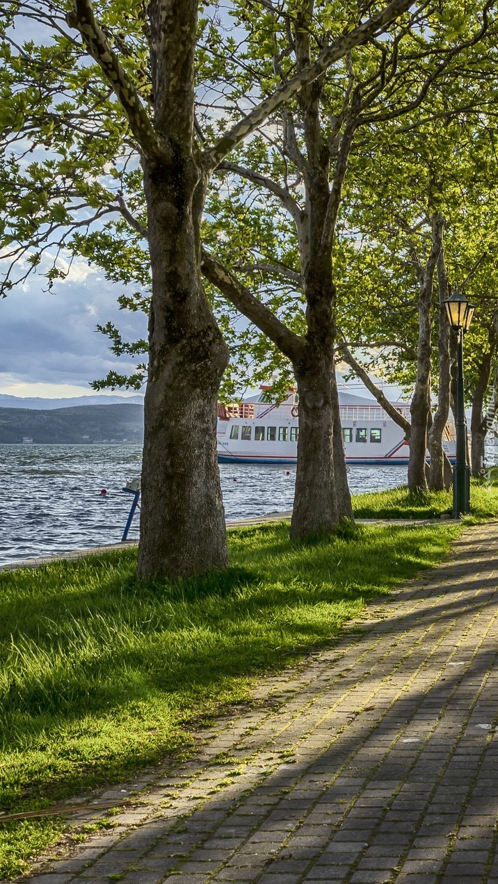 Edytor tapety: Drzewa przy chodniku nad jeziorem Kastoria