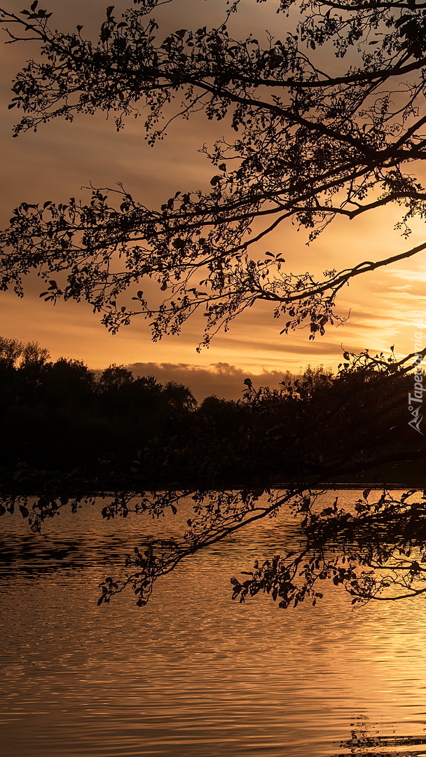 Edytor tapety: Drzewa nad stawem o zachodzie słońca