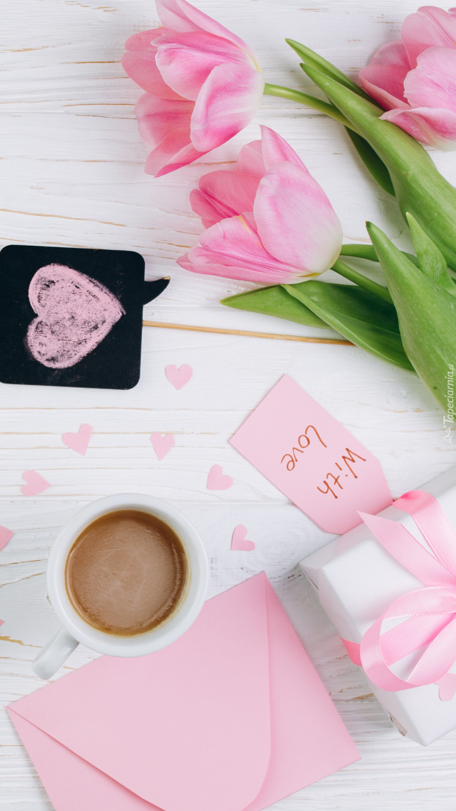 Edytor tapety: Różowe tulipany obok prezentu