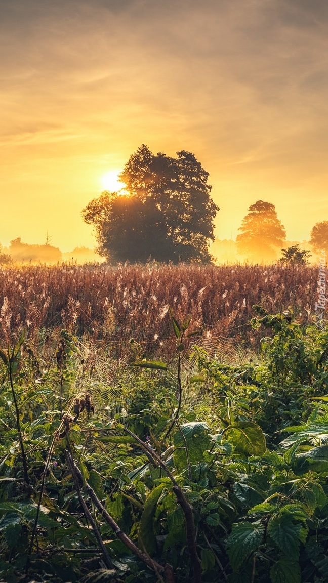 Edytor tapety: Wschód słońca nad zamgloną łąką