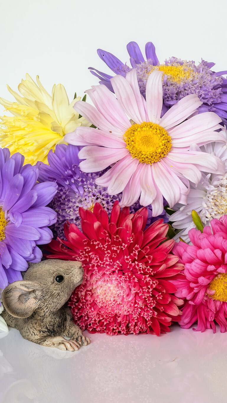 Edytor tapety: Figurka myszki pod kolorowymi astrami