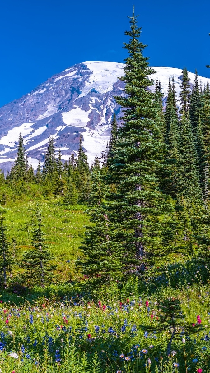 Edytor tapety: Świerki na tle stratowulkanu Mount Rainier