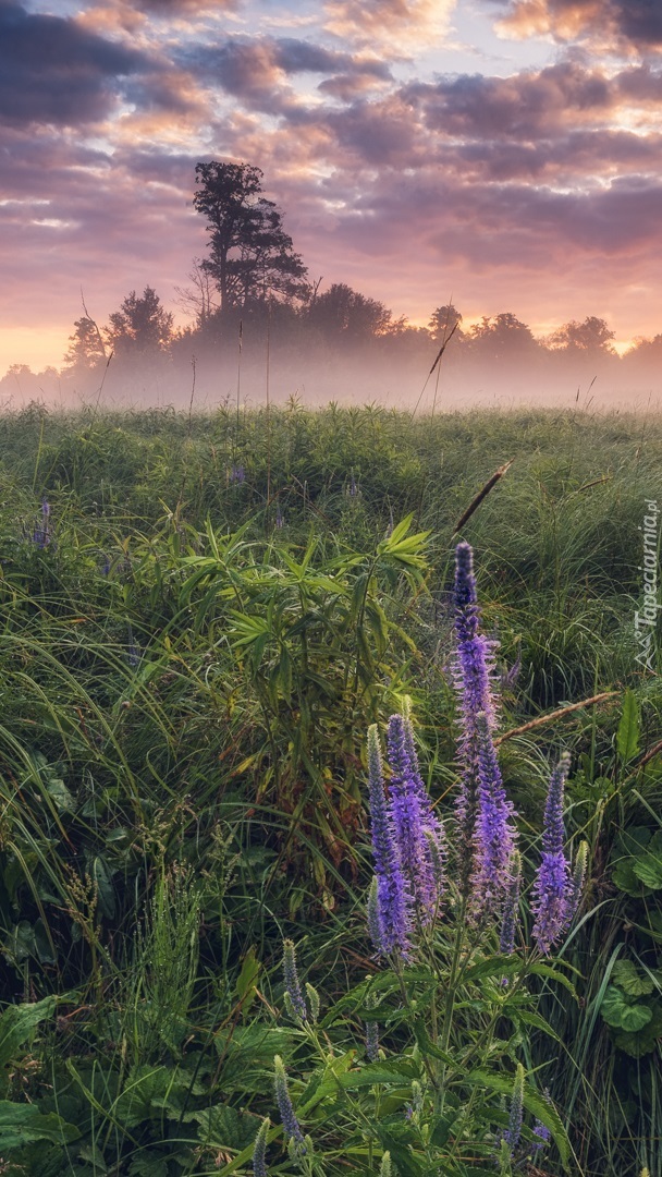 Edytor tapety: Drzewa na zamglonej łące