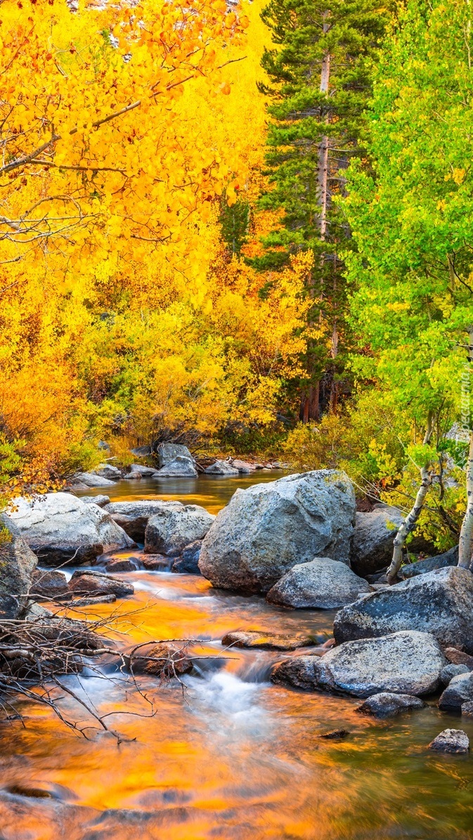 Edytor tapety: Pożółkłe drzewa nad kamienistą rzeką