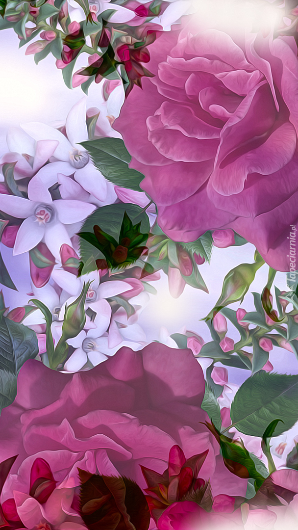 Edytor tapety: Róże i białe kwiatki w grafice