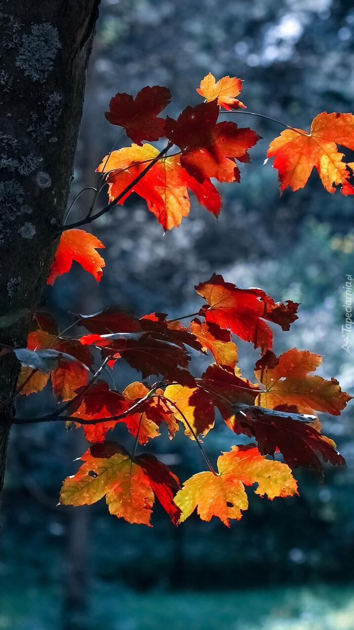 Edytor tapety: Rozświetlone liście na pniu drzewa