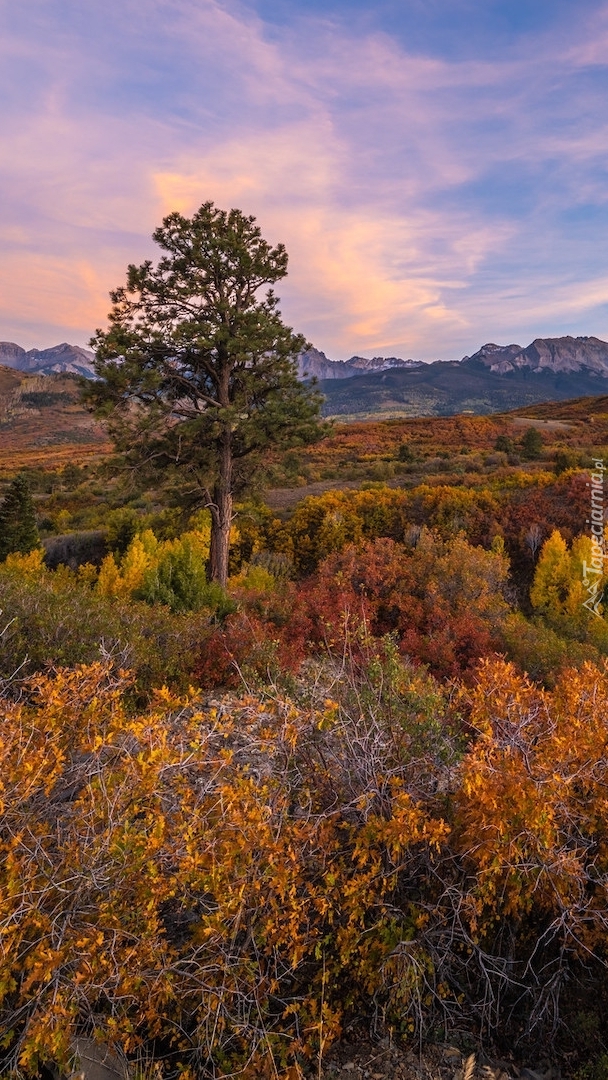 Edytor tapety: Drzewo pośród kolorowych krzewów